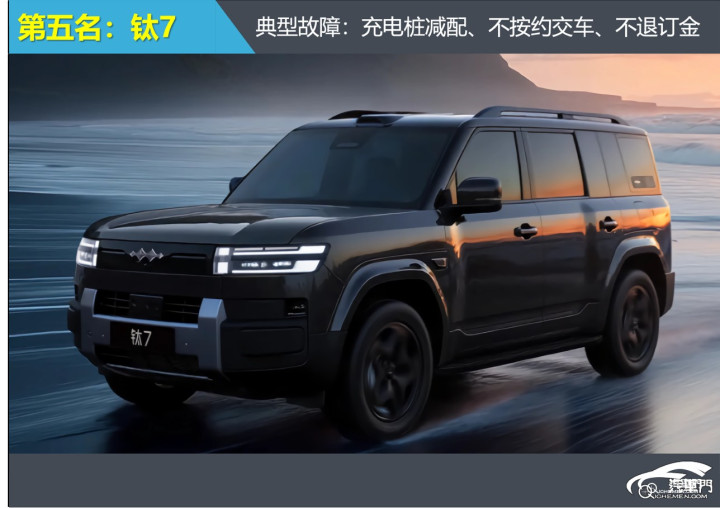 汽车质料投诉点评:12月,钛7再度登上榜单,该车型投诉指数为147.3,环比下落57.73%。充电桩减配、不按约交车两大问题依然是钛7车主的投诉主力。本年10月,方程豹品牌在未奉告车主的前提下,对钛7车主申问候装的充电桩进行“升级”。新款充电桩不仅外不雅质感下落,中枢功能也被取消。很多钛7车主称,充电桩问题已屡次投诉,但于今官方未予以回应。此外,方程豹官方应许下订钛7可在3-6周内交车,但多半钛7车主投诉称,钛7未按应许时辰委派。部分钛7车主得知无法按约提车后,肯求退还订金,但4S店拒却退还。