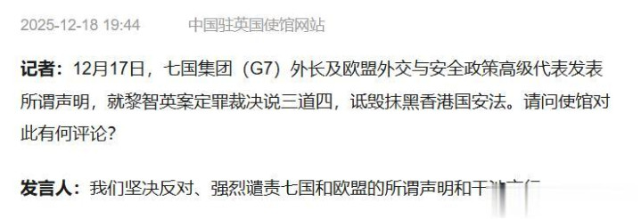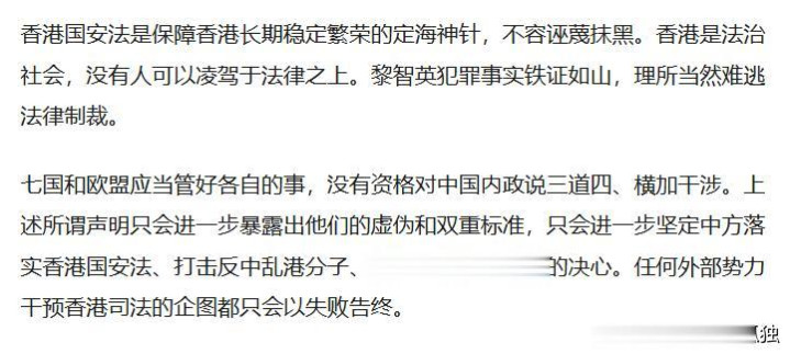 紧接着七国集团外长抱团发布和谐声明,倒置吵嘴条件中方开释黎智英。